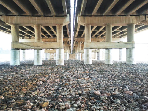如今,沙河特大桥已没有20多天来施工大军昼夜奔忙、热火朝天的劳动景象,取而代之的是让建设者们十分欣慰的成果:40根做过外包防护的桩基整齐排列,脚底下是40m范围的钢丝石笼,构成了一道靓丽的风景线。