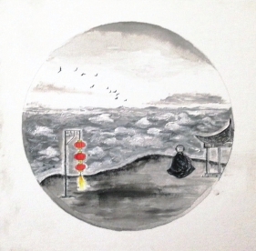 绘画是引人深思,给我内心平静的“魔法”。图②这幅画叫做“念”,是最让我平静的画。画幅不大,坐山观云海,避世亦难免记挂凡尘,红色的灯笼代表万家灯火的尘世。我不知画中长者在这云海日出之际,心中是万念皆空,还是为苍生祈福。每次看画,似乎我也进入画中,心就随之平静下来,和长者一起沉思。
