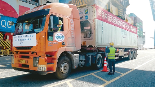 刚卸船的智利车厘子被快速装上等候在南沙码头边的货车上 李活龙 摄